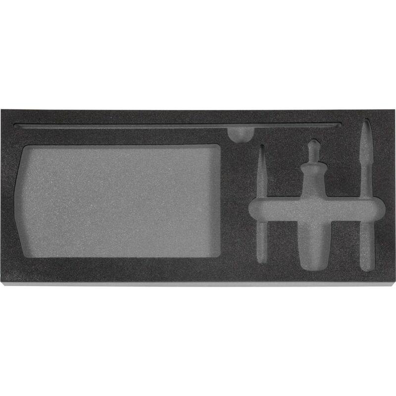 Assortimenti standard di utensili in alloggiamenti sagomati in espanso rigido bicolore in PE. La struttura non porosa dell'espanso è impermeabile e resistente agli oli. Strato superiore color antracite, quello inferiore di contrasto color grigio mette in evidenza gli utensili mancanti. Dati tecnici Tipo di prodotto Inserto in espanso rigido Forma in espanso rigido LD45, spessore, mm 30 Larghezza, mm 383 Numero di utensili 5 Shadow Board, mm 176 Profondità, mm 176 Esecuzione vuoto per assortimenti di utensili