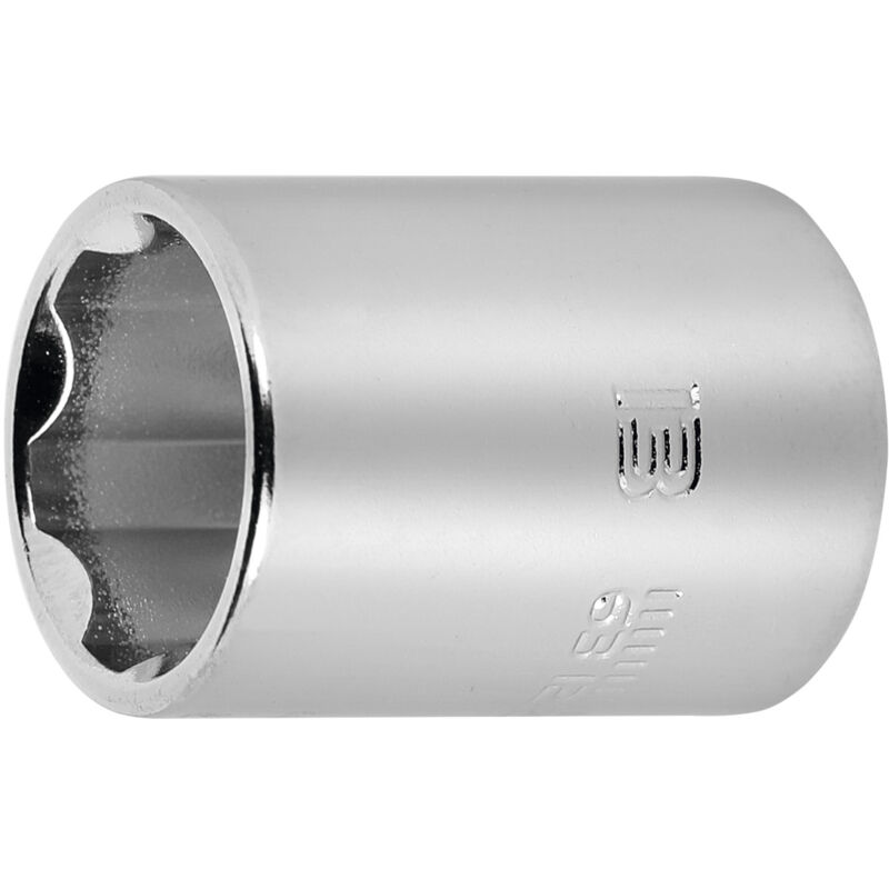 Forgiate in acciaio di alta qualità, svasate internamente per una rapida presa sulle teste delle viti. Quadro femmina con foro a norma DIN 3120-D 6,3. La bocca Surface Drive permette un accoppiamento più preciso e un'azione più efficace. La pressione viene esercitata direttamente sulla superficie dei dadi e delle viti, affinché i bordi delicati non vengano danneggiati. Con Surface Drive è anche possibile stringere o allentare sia viti di misure intermedie, per esempio in pollici (A/F, BSF, BSW) sia viti usurate. Bussole con foro di tenuta. Materiale: Acciaio al cromo-vanadio, cromato. Dati tecnici Con profilo AS-drive no Superficie cromato Quadro di manovra femmina Zoll 1/4 Materiale Acciaio al cromo-vanadio Norma DIN 3124 Profilo chiavi esagonali Surfacedrive Tipo di prodotto Bussola Apertura, mm 13 Lunghezza, mm 24,8 Per misure in pollici (misure americane), Zoll 1/2 ⌀ Lato uscita, mm 18