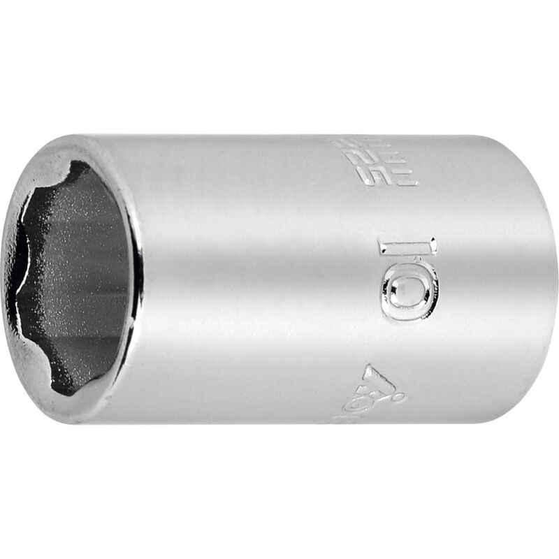 Forgiate in acciaio di alta qualità, svasate internamente per una rapida presa sulle teste delle viti. Quadro femmina con foro a norma DIN 3120-D 6,3. La bocca Surface Drive permette un accoppiamento più preciso e un'azione più efficace. La pressione viene esercitata direttamente sulla superficie dei dadi e delle viti, affinché i bordi delicati non vengano danneggiati. Con Surface Drive è anche possibile stringere o allentare sia viti di misure intermedie, per esempio in pollici (A/F, BSF, BSW) sia viti usurate. Bussole con foro di tenuta. Materiale: Acciaio al cromo-vanadio, cromato. Dati tecnici Con profilo AS-drive no Superficie cromato Quadro di manovra femmina Zoll 1/4 Materiale Acciaio al cromo-vanadio Norma DIN 3124 Profilo chiavi esagonali Surfacedrive Tipo di prodotto Bussola Apertura, mm 10 Lunghezza, mm 24,8 Per misure in pollici (misure americane), Zoll 3/8 ⌀ Lato uscita, mm 14,5