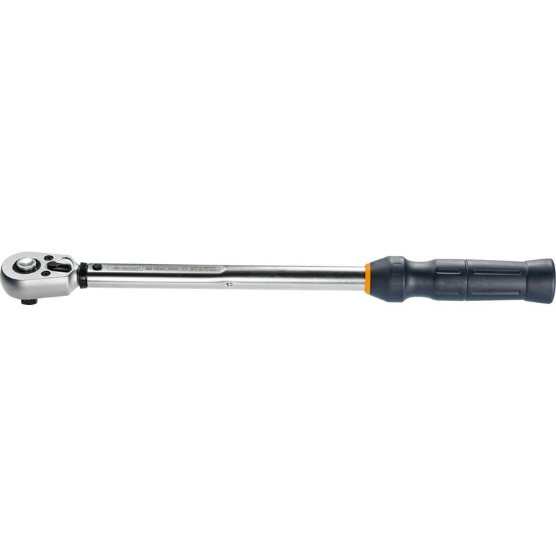DescrizioneEsecuzione:Chiave dinamometrica ad asta unica senza scala graduata. Impostazione del valore di coppia desiderato mediante lo strumento di regolazione 657455 Dim. 1 abbinato a uno strumento di controllo adeguato.Con cricchetto reversibile fisso ed estrattore − per serraggio orario e antiorario. Chiave dinamometrica con rilascio solo a destra.Funzione:Raggiunto il valore di coppia impostato, la chiave si disarma emettendo un segnale acustico e tattile ed è poi subito pronta all'uso.Uso:Per il serraggio controllato delle viti in base al valore di coppia preimpostato per lavori in serie.Norma:Collaudata a norma DIN EN ISO 6789.Precisione:± 2% dal valore impostato.Dati tecnici Coppia max. 50 N·m Direzione di serraggio Serraggio orario e antiorario Precisione di misura della coppia ±2 % Taratura O6;