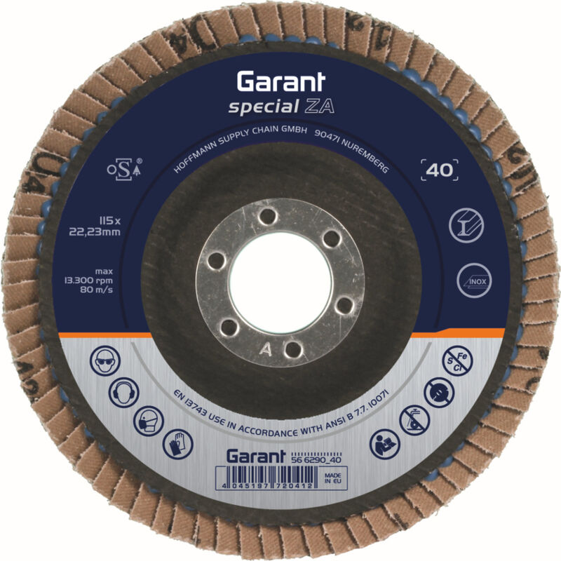 Disco abrasivo lamellare con sporgenza lamelle molto grande (10 mm). Capacità di asportazione e durata elevate grazie allo zirconio (ZA) di elevata qualità su tessuto misto robusto. Con rivestimento abrasivo per lavorazione più fredda. * Forma obliqua − per lavorazione bordi, punti di saldatura e in piano con angolo di registro 15-25°. Uso: Ideale per diversi lavori di levigatura di piani e contorni e per la lavorazione di punti di difficile accesso come ad esempio la molatura di saldature d'angolo. Dati tecnici Acciaio < 1400 N/mm² m/s idoneo a secco idoneo Acciaio < 60 HRC m/s idoneo Acciaio < 900 N/mm² m/s idoneo Uni m/s limitatamente adatto Acciaio < 55 HRC m/s idoneo GG(G) m/s idoneo Ti m/s limitatamente adatto Acciaio < 67 HRC m/s idoneo INOX m/s idoneo Percentuale di ferro, zolfo e cloro % < 0,1 Velocità periferica massima m/s 80 Sigla materiale abrasivo ZA Attributo del nome del prodotto ⌀ 115 mm Tipo di prodotto Disco abrasivo lamellare ⌀ Foro, mm 22,23 Grana 40 della forma