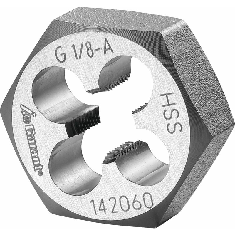 per la ripassatura. Uso: Per filettatura gas, Whitworth cilindrica DIN ISO 228/1. Dati tecnici Acciaio < 500 N/mm² m/min idoneo CuZn m/min limitatamente adatto Acciaio < 1100 N/mm² m/min limitatamente adatto Alluminio (a truciolo corto) m/min limitatamente adatto a secco limitatamente adatto Acciaio < 900 N/mm² m/min idoneo Olio idoneo INOX < 900 N/mm² m/min limitatamente adatto Acciaio < 750 N/mm² m/min idoneo Tipo di filettatura G Norma DIN 382 Materiale da taglio HSS Angolo di filetto Grad 55 Tipo di prodotto Filiere Misura del filetto G1/8 Classe di tolleranza A Apertura, mm 27 Altezza, mm 11 Direzione di taglio destra Filetti per pollice 28 ⌀ Filettatura, mm 9,73