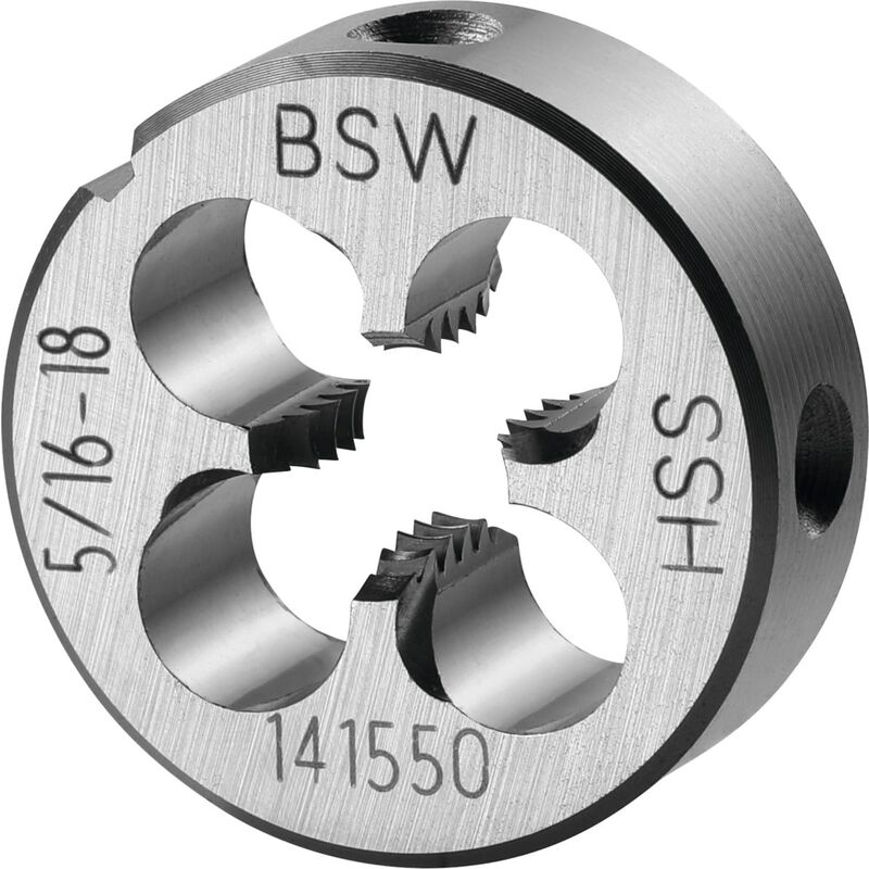 con imbocco corretto su entrambi i lati per agevolare l'esecuzione del filetto ed evacuare correttamente i trucioli nella direzione di taglio. Imbocco a 1 spira e 3/4. Uso: Per filettatura Whitworth a norma BSW BS84 nel campo di tolleranza media. Dati tecnici Olio idoneo Acciaio < 500 N/mm² m/min idoneo Acciaio < 750 N/mm² m/min idoneo Alluminio (a truciolo corto) m/min limitatamente adatto a secco limitatamente adatto Angolo di filetto Grad 55 Norma EN 22568 Materiale da taglio HSS Tipo di filettatura BSW Tipo di prodotto Filiere Misura del filetto W5/16 Classe di tolleranza medio Altezza, mm 9 Direzione di taglio destra Filetti per pollice 18 ⌀ Filettatura, mm 7,94 ⌀ Esterno, mm 25
