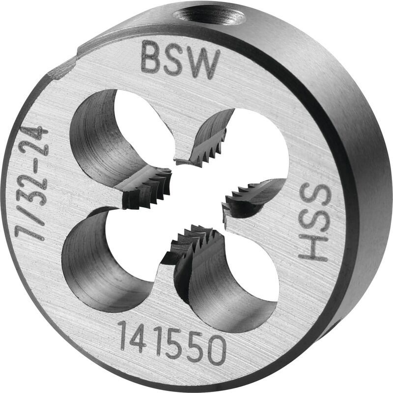 con imbocco corretto su entrambi i lati per agevolare l'esecuzione del filetto ed evacuare correttamente i trucioli nella direzione di taglio. Imbocco a 1 spira e 3/4. Uso: Per filettatura Whitworth a norma BSW BS84 nel campo di tolleranza media. Dati tecnici Olio idoneo Acciaio < 500 N/mm² m/min idoneo Acciaio < 750 N/mm² m/min idoneo Alluminio (a truciolo corto) m/min limitatamente adatto a secco limitatamente adatto Angolo di filetto Grad 55 Norma EN 22568 Materiale da taglio HSS Tipo di filettatura BSW Tipo di prodotto Filiere Misura del filetto W7/32 Classe di tolleranza medio Altezza, mm 7 Direzione di taglio destra Filetti per pollice 24 ⌀ Filettatura, mm 5,56 ⌀ Esterno, mm 20