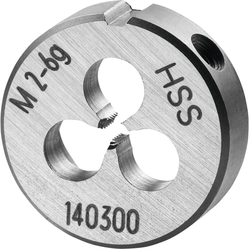 Forma chiusa preincisa. ≥ M3 con imbocco corretto su entrambi i lati per agevolare l'esecuzione del filetto ed evacuare correttamente i trucioli nella direzione di taglio. Imbocco a 1 spira e 3/4. Dati tecnici Alluminio (a truciolo corto) m/min limitatamente adatto a secco limitatamente adatto Olio idoneo Acciaio < 750 N/mm² m/min idoneo Acciaio < 500 N/mm² m/min idoneo Tipo di filettatura M Materiale da taglio HSS Norma EN 22568 Angolo di filetto Grad 60 Direzione di taglio destra Tipo di prodotto Filiere Misura del filetto M2 Classe di tolleranza DIN 13 6g Passo, mm 0,4 Altezza, mm 5 ⌀ Esterno, mm 16