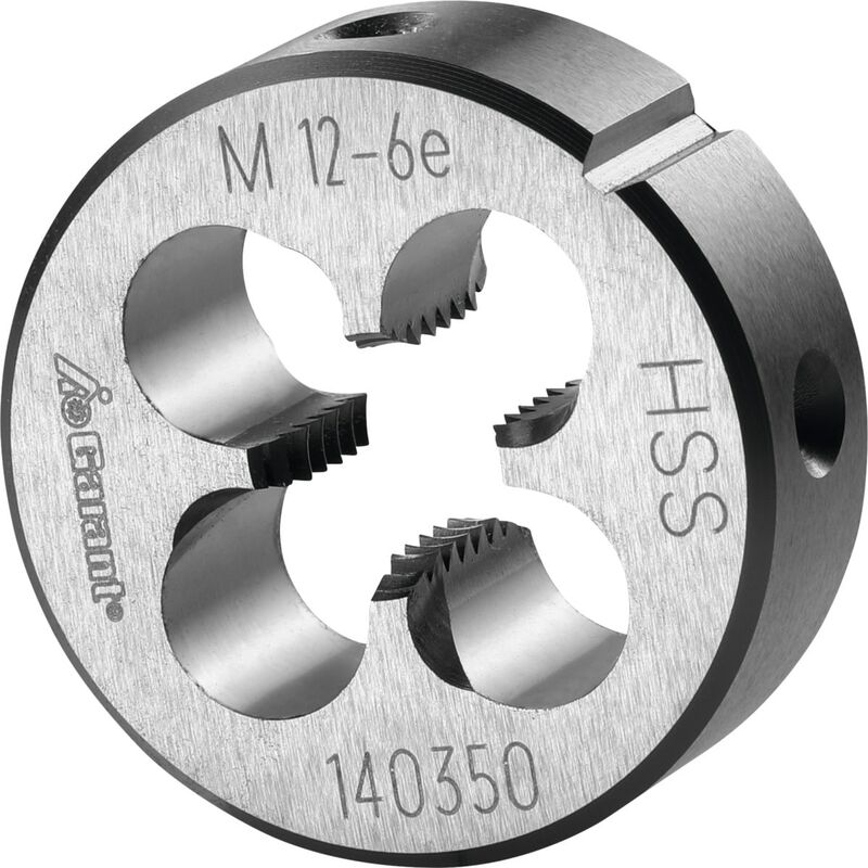 Forma chiusa preincisa. ≥ M3 con imbocco corretto su entrambi i lati per agevolare l'esecuzione del filetto ed evacuare correttamente i trucioli nella direzione di taglio. Imbocco a 1 spira e 3/4. Campo di tolleranza 6e = con sottomisura ca. 0,03 − 0,04 mm. Per la classe di tolleranza “media”, se i perni sono trattati con uno strato galvanico protettivo. Dati tecnici Olio idoneo a secco limitatamente adatto Acciaio < 750 N/mm² m/min idoneo Acciaio < 500 N/mm² m/min idoneo Alluminio (a truciolo corto) m/min limitatamente adatto Tipo di filettatura M Norma EN 22568 Direzione di taglio destra Materiale da taglio HSS Angolo di filetto Grad 60 Tipo di prodotto Filiere Misura del filetto M12 Classe di tolleranza DIN 13 6e Passo, mm 1,75 Altezza, mm 14 ⌀ Esterno, mm 38