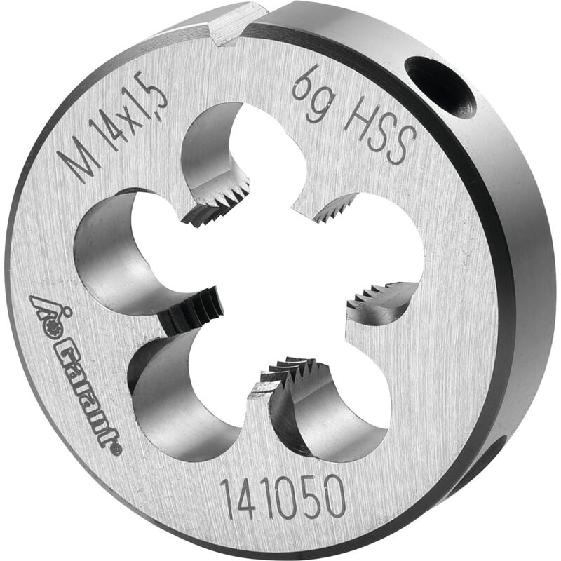 Forma chiusa preincisa con imbocco corretto su entrambi i lati. Imbocco a 1 spira e 3/4. Dati tecnici Olio idoneo Alluminio (a truciolo corto) m/min limitatamente adatto Acciaio < 500 N/mm² m/min idoneo a secco limitatamente adatto Acciaio < 750 N/mm² m/min idoneo Materiale da taglio HSS Tipo di filettatura MF Angolo di filetto Grad 60 Norma EN 22568 Direzione di taglio destra Tipo di prodotto Filiere Misura del filetto M14×1,5 Classe di tolleranza DIN 13 6g Passo, mm 1,5 Altezza, mm 10 ⌀ Esterno, mm 38