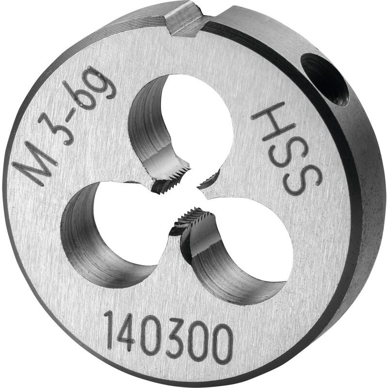 Forma chiusa preincisa. ≥ M3 con imbocco corretto su entrambi i lati per agevolare l'esecuzione del filetto ed evacuare correttamente i trucioli nella direzione di taglio. Imbocco a 1 spira e 3/4. Dati tecnici Alluminio (a truciolo corto) m/min limitatamente adatto a secco limitatamente adatto Olio idoneo Acciaio < 750 N/mm² m/min idoneo Acciaio < 500 N/mm² m/min idoneo Tipo di filettatura M Materiale da taglio HSS Norma EN 22568 Angolo di filetto Grad 60 Direzione di taglio destra Tipo di prodotto Filiere Misura del filetto M3 Classe di tolleranza DIN 13 6g Passo, mm 0,5 Altezza, mm 5 ⌀ Esterno, mm 20