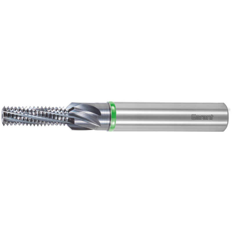 Fresa a filettare in HMI con divisione irregolare e maggior numero di taglienti. La divisione irregolare permette una notevole silenziosità e un'elevata durata dell'utensile. Geometria universale innovativa e rivestimento ad alte prestazioni per l'utilizzo su un'ampia gamma di materiali. * Netta riduzione delle vibrazioni grazie alla divisione irregolare * Numero di taglienti maggiore * Rivestimento HiPIMS a base di AlTiN di ultima generazione. * Profilo della filettatura corretto contro possibili distorsioni Vantaggi: Tagliente di svasatura a 90° lato codolo per svasare e fresare a filettare con un'unica operazione. Nota: Forme HB e HE disponibili allo stesso prezzo di HA. Ordinare le forme HB: con n. art. 139664 + 129100 HB. Ordinare le forme HE: con n. art. 139664 + 129100 HE. Passaggio interno per LR: sì Numero denti Z: 4 Passo della filettatura: 0,7 mm ⌀ Nominale DC: 3,1 mm Lunghezza taglienti Lc: 10,15 mm Lunghezza codolo Ls: 36,13 mm Lunghezza complessiva L: 58 mm ⌀ Codolo Ds