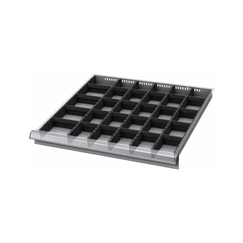 Listelli fessurati laterali, divisori fessurati e separatori lisci ad incastro in plastica. I divisori fessurati vengono fissati con clip nelle fessure del cassetto. I separatori lisci ad incastro vengono inseriti nei divisori fessurati. I divisori riempiono completamente un cassetto 26×24G. Per: Cassetti 26×24G. Contenuto: Set di listelli fessurati laterali n. art. 951580: 1× Dim. 75 Pannelli fessurati n. art. 951530: 5× Dim. 75 Parete divisoria a incastro 4G n. art. 951741: 20× Dim. 75 Parete divisoria a incastro 6G n. art. 951761: 4× Dim. 75 Dati tecnici Attributo del nome del prodotto 26×24G Tipo di prodotto Parete divisoria per cassetti Per altezza frontalini dei cassetti, mm 75 Superficie utile dei cassetti in G 26×24 Per cassetti con larghezza utile in G 26 Per cassetti con profondità utile in G 24 Altezza, mm 50 Peso, kg 1,058 Per cassetti larghezza utile, mm 650 Per cassetti profondità utile, mm 600