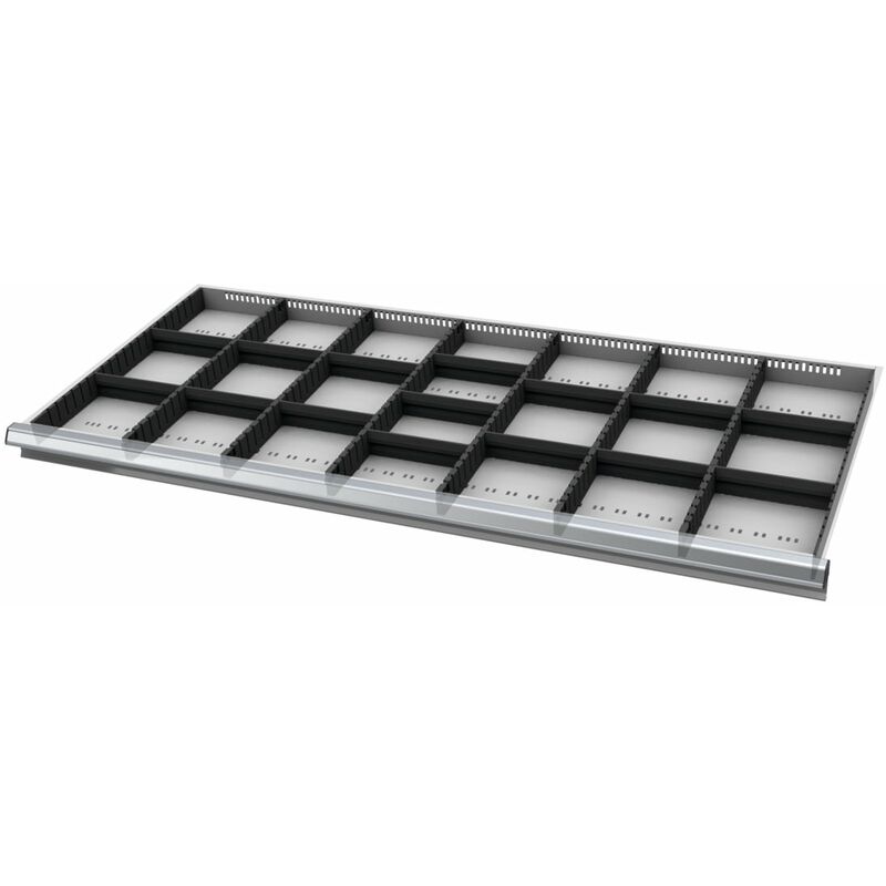 Listelli fessurati laterali, divisori fessurati e separatori lisci ad incastro in plastica. I divisori fessurati vengono fissati con clip nelle fessure del cassetto. I separatori lisci ad incastro vengono inseriti nei divisori fessurati. I divisori riempiono completamente un cassetto 56×24G. Per: Cassetti 56×24G. Contenuto: Set di listelli fessurati laterali n. art. 951580: 1× Dim. 100 Pannelli fessurati n. art. 951530: 6× Dim. 100 Parete divisoria a incastro 8G n. art. 951781: 15× Dim. 100 Dati tecnici Attributo del nome del prodotto 56×24G Tipo di prodotto Parete divisoria per cassetti Per altezza frontalini dei cassetti, mm 100 Superficie utile dei cassetti in G 56×24 Per cassetti con larghezza utile in G 56 Per cassetti con profondità utile in G 24 Altezza, mm 75 Peso, kg 2,63 Per cassetti larghezza utile, mm 1.400 Per cassetti profondità utile, mm 600