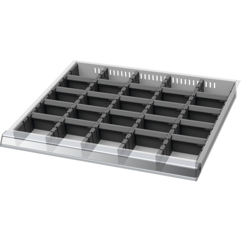 Listelli fessurati laterali, divisori fessurati bilaterali e separatori lisci ad incastro in plastica. I divisori fessurati vengono fissati con clip nelle fessure del cassetto. I separatori ad incastro vengono inseriti nei divisori fessurati. Il divisore riempie un cassetto completo 20×16G. Per: Cassetti 20×16G. Contenuto: Set di listelli fessurati laterali n. art. 951560: 1× Dim. 125 Pannelli fessurati n. art. 951510: 4× Dim. 125 Parete divisoria a incastro n. art. 951741: 20× Dim. 125 Dati tecnici Attributo del nome del prodotto 20×16G Tipo di prodotto Parete divisoria per cassetti Per altezza frontalini dei cassetti, mm 125 Superficie utile dei cassetti in G 20×16 Per cassetti con larghezza utile in G 20 Per cassetti con profondità utile in G 16 Altezza, mm 100 Peso, kg 1,64 Per cassetti larghezza utile, mm 500 Per cassetti profondità utile, mm 400
