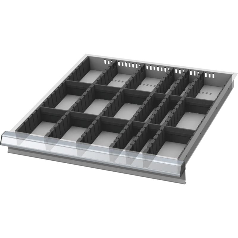 Listelli fessurati laterali, divisori fessurati e separatori ad incastro in plastica. I divisori fessurati vengono fissati con clip nelle fessure del cassetto. I separatori lisci ad incastro vengono inseriti nei divisori fessurati. I set riempiono completamente un cassetto 20×20G. Per: Cassetti 20×20G. Contenuto: Set di listelli fessurati laterali n. art. 951570: 1× Dim. 100 Divisori fessurati bilaterali n. art. 951520: 5 × Dim. 100 Separatori lisci ad incastro 2G n. art. 951721: 4× Dim. 100 Separatori lisci ad incastro 4G n. art. 951741: 8× Dim. 100 Dati tecnici Attributo del nome del prodotto 20×20G Tipo di prodotto Parete divisoria per cassetti Per altezza frontalini dei cassetti, mm 100 Superficie utile dei cassetti in G 20×20 Per cassetti con larghezza utile in G 20 Per cassetti con profondità utile in G 20 Altezza, mm 75 Peso, kg 1,492 Per cassetti larghezza utile, mm 500 Per cassetti profondità utile, mm 500