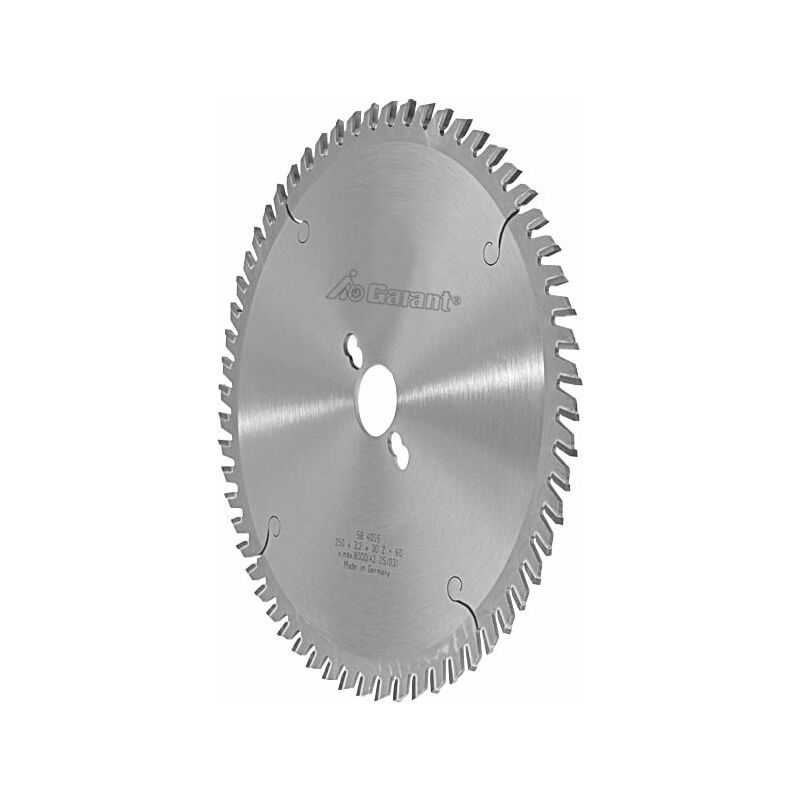 Riporto di carburo metallico, esecuzione di precisione con lama ad alta resistenza, insonorizzate. Tagliente di grandi dimensioni in metallo duro per riaffilature frequenti. Uso: Per seghe a pendolo, circolari, per tagli obliqui e doppi. Modello KW per pannelli, impiallicciatura nobilitata e rivestimento di materia plastica su ambo i lati, nonché materiali con trattamento superficiale per esigenze elevate di qualità di taglio. Nota: Altre seghe circolari: consultare il Gruppo 17. Dati tecnici Tipo di prodotto Lama per seghe circolari Larghezza di taglio B, mm 3,5 Fori di trascinamento numero/⌀/interasse, mm 2/7/42 e 2/9/46 e 2/10/60 ⌀ Foro, mm 30 Numero denti 84 ⌀ Lama D, mm 350