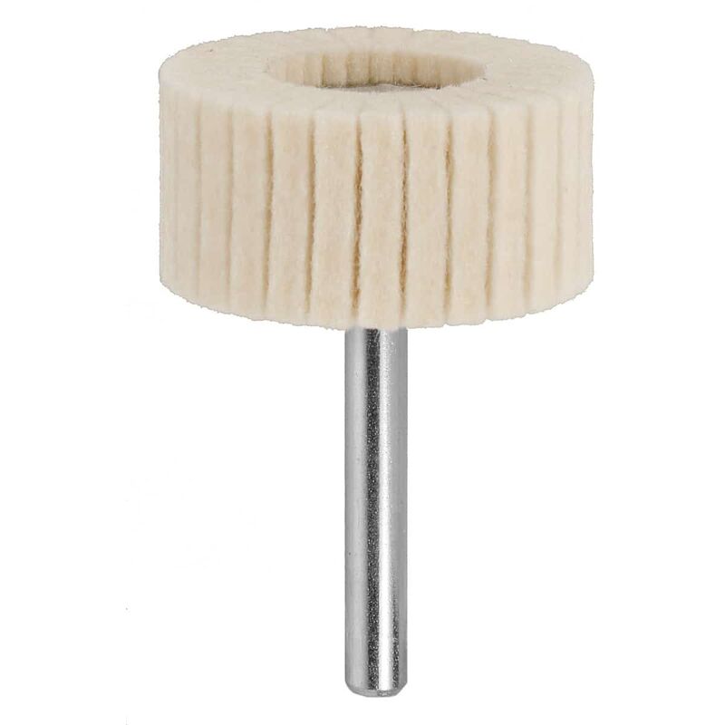 Disposizione a ventaglio del feltro attorno al codolo. Uso: Lavori di lucidatura con flessibilità e adattamento ai contorni maggiori. L'uso successivo dell'esecuzione medio-dura e morbida permette di ottenere superfici a specchio di notevole qualità. Nota: Le lamelle/spazzole di lucidatura in feltro vanno usate in combinazione unitamente a paste abrasive e per lucidatura come n. art. 552250 / 555740. Velocità periferica consigliata 5 - 10 m/s. Dati tecnici Grado durezza medio Tipo di prodotto Mola di lucidatura ⌀ Testa, mm 40 Lunghezza della testina, mm 20 ⌀ Gambo, mm 6