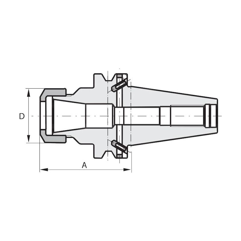 Coni interni ed esterni rettificati. * Tutti i codoli con tornitura dura (silenziosità!). Qualità di equilibratura G 2,5 / 25.000 min-1. * Ghiera di serraggio con equilibratura fine (G 2,5/25.000 min-1). * Ottime proprietà antiusura e buona trasmissione della coppia grazie alla ghiera di serraggio di precisione rivestita. Uso: Per il serraggio di utensili con codolo cilindrico nelle pinze a norma DIN 6499 − forme A e B. Fornitura: Con ghiera di serraggio ER. Accessori speciali: Pinze ER n. art. 308881 - 309434, chiavi di serraggio ER n. art. 309680 - 309745 o n. art. 613300. Codoli (AB) n. art. 308760 − 308802, chiavi di serraggio AB n. art. 308820 − 308835. Nota: Ghiera di serraggio adatta n. art. 309580 oppure 309610. Dati tecnici Precisione della concentricità radiale µm ≤ 3 Strategia di truciolatura HSC Adattatore BT 50 A = 100 Tipo di prodotto Mandrini a pinza Campo di serraggio, mm 2 - 20 ⌀ Attacco D1, mm 2-20 Sporgenza totale Dim. A, mm 100 Ghiera di serraggio ER di ricambio