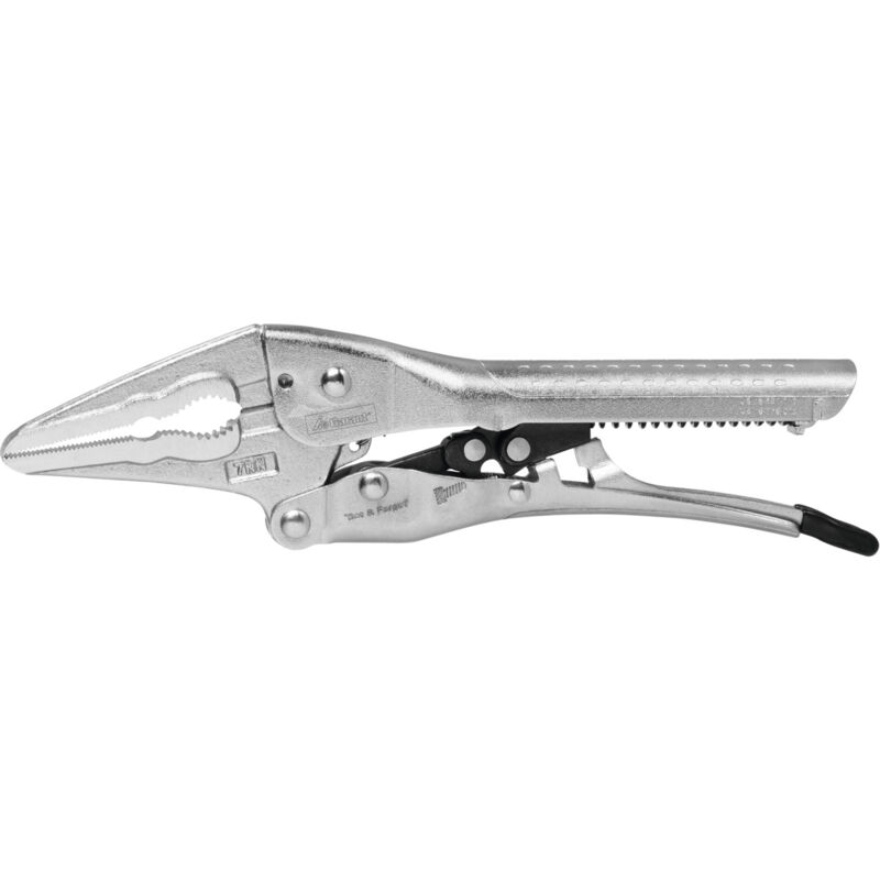 Regolazione automatica alla rispettiva apertura, quindi facilità di impiego con una sola mano. Straordinaria regolazione della forza di serraggio per una pressione di serraggio costante per tutto il campo di apertura. Forma della bocca lunga e sottile con superfici di presa dentate. Uso: Per il serraggio rapido ed efficiente di lamiere e profilati. Pressione di serraggio fino a 10.000 N. Ricambi: Molla di ricambio n. art. 708301 Dim. 5CJ e 8,5CJ. Dati tecnici Tipo di prodotto Pinza regolabile Apertura, mm 44 Lunghezza griffe, mm 53