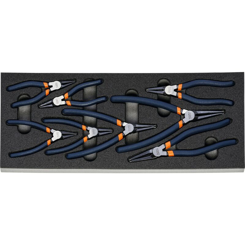 Assortimenti di utensili in alloggiamenti sagomati in espanso rigido bicolore in PE. La struttura non porosa dell'espanso è resistente all'olio e impermeabile. Strato superiore color antracite, quello inferiore di contrasto grigio mette subito in evidenza gli utensili mancanti. Gli alloggiamenti in espanso rigido riempiono 1/4 (10 G × 8 G o 250 × 200 mm) o 1/2 (20 G × 8 G o 500 × 200 mm) della superficie utile dei cassetti. Per: Nuovi carrelli portautensili GARANT per officina con cassetti a estrazione totale e un passo nuovo da 20 G × 16 G o 500 × 400 mm (larghezza × profondità). Fornitura: Pinza di precisione GARANT per anelli sicurezza n. art. 719870 Dim. A0;