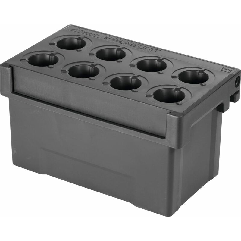 Portautensili in polipropilene resistente all'usura, con boccole per il codolo dell'utensile. Il portautensili può essere utilizzato come unità singola per il trasporto e la custodia, ma si adatta anche perfettamente come componente flessibile in carrelli, armadi per macchine CN, scaffali per macchine a CN e guide portanti UNIT. Uso: Per l'inserimento in guida portante, guida profilata per carrelli, armadi per macchine a CN e guida Multifix. Dati tecnici Tipo di prodotto Sistema di supporto per macchine a CN Larghezza, mm 240 Altezza, mm 130 Materiale Polipropilene Numero boccole portautensili 8 Profondità, mm 148 Interasse A, mm 55 Per codoli utensili SK 30 Portata, kg 20