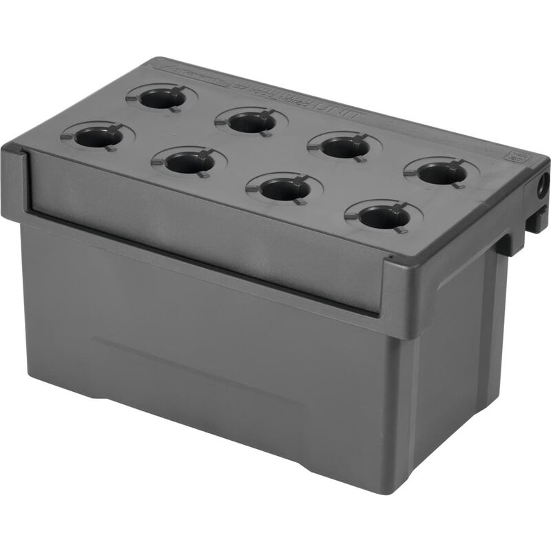 Portautensili in polipropilene resistente all'usura, con boccole per il codolo dell'utensile. Il portautensili può essere utilizzato come unità singola per il trasporto e la custodia, ma si adatta anche perfettamente come componente flessibile in carrelli, armadi per macchine CN, scaffali per macchine a CN e guide portanti UNIT. Uso: Per l'inserimento in guida portante, guida profilata per carrelli, armadi per macchine a CN e guida Multifix. Dati tecnici Tipo di prodotto Sistema di supporto per macchine a CN Larghezza, mm 240 Altezza, mm 130 Materiale Polipropilene Numero boccole portautensili 8 Profondità, mm 148 Interasse A, mm 55 Per codoli utensili VDI 20 Portata, kg 20