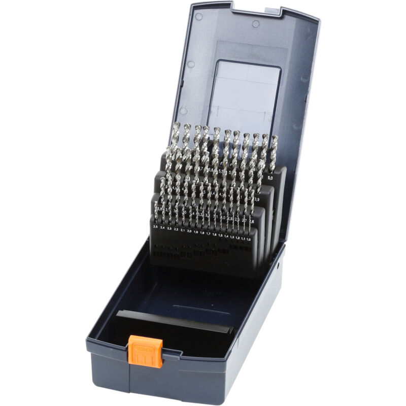 tuttavia, si consiglia di evitare il contatto. Nessuna protezione dall'acqua.Dati tecnici Area di foratura 1 mm - 6 mm Rivestimento non rivestito Materiale da taglio HSS Norma DIN 338 Modello W Tolleranza ⌀ nominale h8 Angolo di affilatura 130 ° Angolo dell'elica 35-40 ° Codolo Codolo cilindrico Numero taglienti Z 2 Passaggio interno per LR no Numero di punte 51 Punte a misure crescenti di 0,1 mm in cassetta si Colore collarino giallo Tipo di prodotto Punta elicoidale Codice articolo 115160 1-6 EAN / GTIN 4045197024589