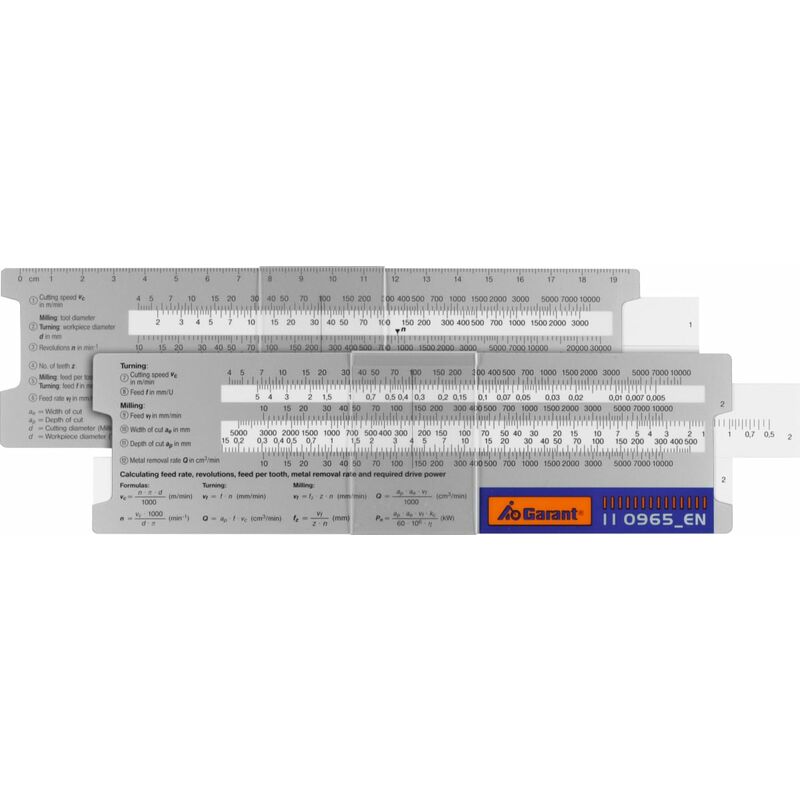DescrizioneEsecuzione:Il regolo calcolatore dei dati di taglio in lingua tedesca (DE) e in lingua inglese (EN) rileva rapidamente e semplicemente i corretti valori operativi per tutte le frese GARANT e per tutti gli utensili da tornio: n = 10 − 30.000 min-1.Dati tecnici Lingua EN Tipo di prodotto Regolo calcolatore Codice articolo 110965 EN EAN / GTIN 4045197704740