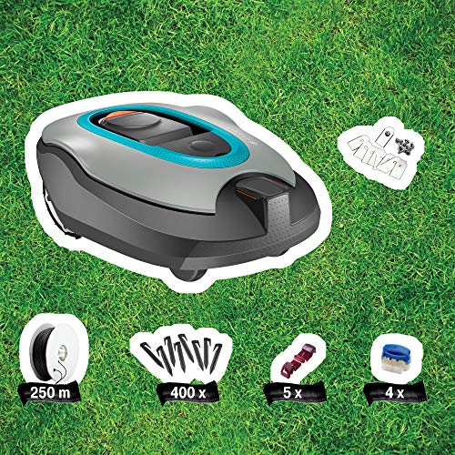 Contenuto della confezione: 1 x Gardena Silleno+, 1 x cavo di delimitazione da 250 m, 400 ganci, 9 x lame di ricambio, 4 x connettori, 5 x morsetti di collegamento