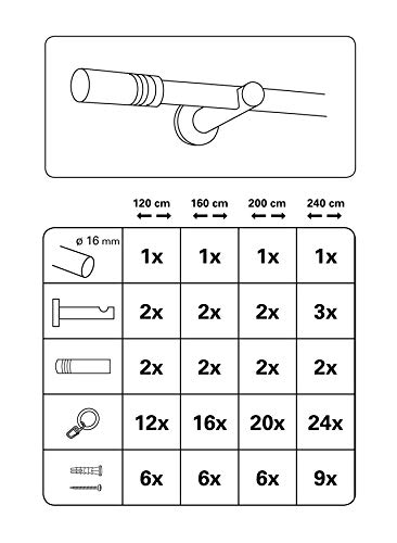 Elegante set composto da Asta per tenda (Diametro 16 mm), 2 cinghie con piastra di montaggio in metallo (Lunghezza 5,5 cm), Terminali in metallo, Anelli per tende, Tutte le parti di montaggio incluse
