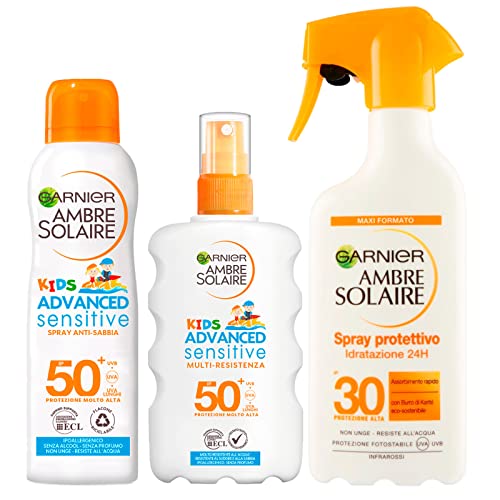 Garnier Ambre Solaire Kids Advanced Sensitive SPF 50+ Spray Multi Resistente da 200ml + Kids Advanced Sensitive SPF 50+ Spray Anti Sabbia da 200ml + Spray Solare SPF 30 con Burro di Karité da 300ml