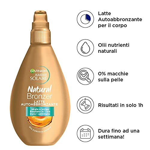 Garnier Ambre Solaire Latte Autoabbronzante Natural Bronzer, Risultato Visibile in 1 Ora, Arricchito con Olio d'Albicocca Nutriente, Formula Vegana, 150 ml