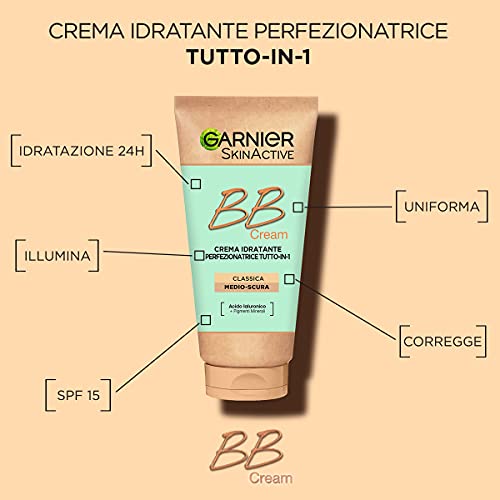 Garnier BB Cream Classica SkinActive, Per Pelle Uniforme e Idratata, Look Naturale, Arricchita con Acido Ialuronico, Aloe Vera e Pigmenti Minerali, SPF 15, Tonalità: Medio-Scura