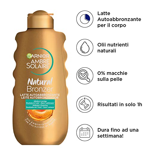 Contenuto: 1x Garnier Latte Autoabbronzante Natural Bronzer, Per un'Abbronzatura Omogenea e Naturale, Risultato in solo 1 Ora che Dura Fino a 1 Settimana, 200 ml