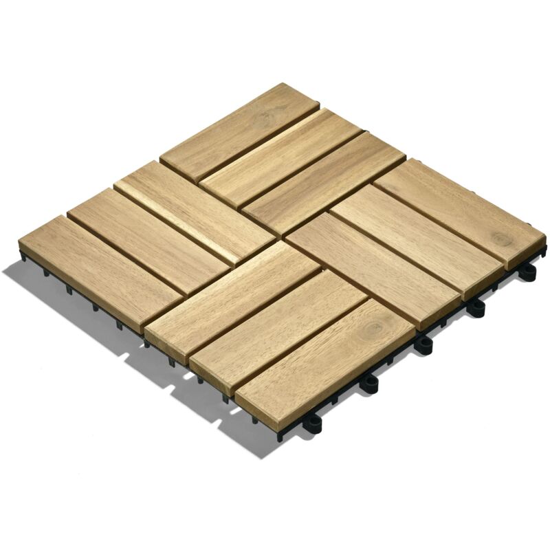 Piastrelle per terrazza in legno di acacia certificato FSC al 100%, set da 10 pezzi (circa 0,9 mq). Dimensioni: circa 30 x 30 x 2,4 cm (lunghezza x larghezza x altezza), facile da spostare grazie al meccanismo a incastro in plastica nella parte inferiore. Per un ambiente confortevole sulla terrazza, sul balcone o nel giardino d'inverno. Utilizzabile anche come strada! Nessun accumulo d'acqua grazie al sistema di drenaggio. Dimensioni delle piastrelle: circa 30 x 30 cm. Materiale: legno di acacia. Antiscivolo, anti-scheggia e non si crepa, resistente agli insetti, non necessita di pretrattamento, elevata capacità di carico. Ambienti di benessere: con le piastrelle regalerete un'oasi di benessere sulla vostra terrazza, sul balcone o nel giardino d'inverno. E tutto con la posa semplice grazie al sistema Click! Non è necessario praticare fori o viti. Il legno di acacia convince con una lunga durata senza molta manutenzione. Installazione: facile da installare grazie al meccanismo a