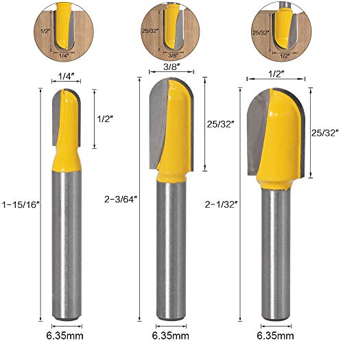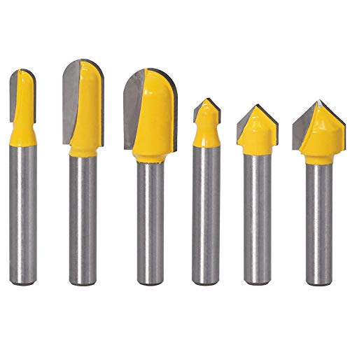 Gasea - Set di 6 punte da 6,35 mm, 3 punte per router, punta per fondo rotondo e 3 scanalature a V di naso, punta per taglio del legno, diametro di taglio 6,35 mm, 9,5 mm, 12,7 mm