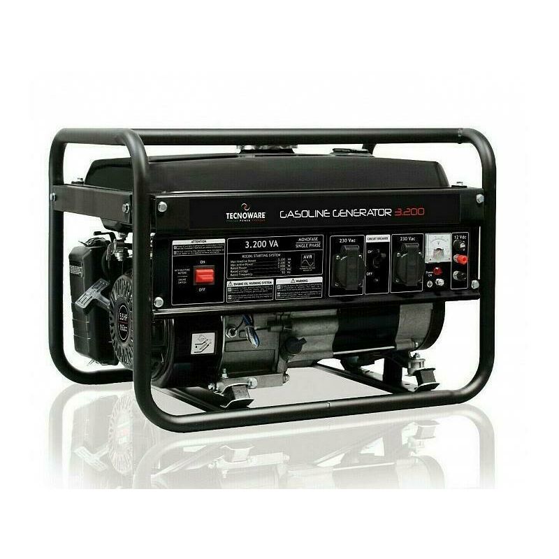 GASOLINE GENERATOR 3200VA RECOIL ST Il generatore di corrente elettrica Tecnoware FGE-3200M è lo strumento ideale per svolgere lavori di lunga durata con un rifornimento costante di energia elettrica. il Tecnoware FGE-3200M è il risultato di una costante ricerca tecnologica mirata all'ottenimento delle migliori prestazioni a costi estremamente contenuti. Possiede un motore OHV a 4 tempi potente e durevole che garantisce grazie all'ampio serbatoio in metallo 10 ore di funzionamento al 50% di carico. Dotato di 2 prese di uscita shuko da 16A e di un uscita 12V DC 8A. Specifiche Tecniche SPECIFICHE DI BASE Frequenza: 50 Hz Tensione: 230 V Potenza di picco: 3,2 kW Dimensioni: 43x42x63 cm Peso: 41,5 Kg Rumorosità a 7 metri: 68-72 dB(A) MOTORE Modello motore: TW168F Tipo: OHV monocilindrico raffreddato ad aria forzata a 4 tempi Cilindrata: 196 cc Potenza nominale: 6.5 HP Accensione: tramite corda a strappo Prese di uscita Dotato di 2 prese schuko da 16A e e un uscita DC 12V 8A