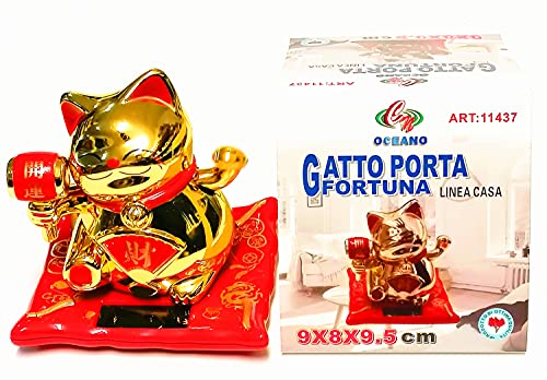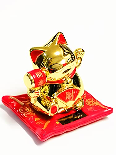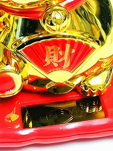 Gatto Portafortuna Cinese con Zampa in Movimento a Luce Solare. Rosso e Dorato H=9x8x9,5 cm