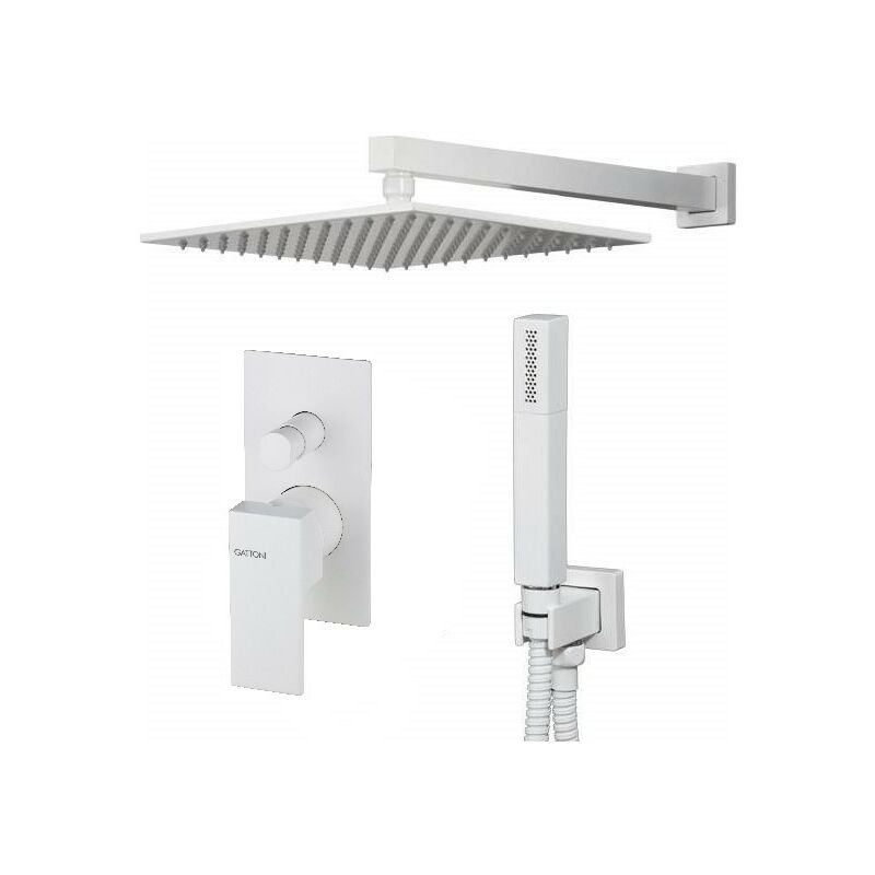 Kit doccia completo di miscelatore in ottone soffione doccia 250 x 250 mm colore bianco opaco | Gattoni Rubinetterie Kubick KTQ15/PDBO Cerchi un miscelatore doccia completo modello minimale quadro? questo prodotto della serie Kubik Di Gattoni Rubinetterie ha un design moderno e contemporaneo, proposto in ben 4 colori differenti realizzati all'interno dell'azienda, potrai arredare il tuo bagno con stile unico e con un tocco di lusso. Composto da miscelatore meccanico con deviatore e doccia a mano in ottone con flessibile 150 cm, il soffione doccia quadro 250 x 250 mm è in ottone. CARATTERISTICHE: Marca: Gattoni Rubinetterie Serie: Kubik Miscelatore doccia incasso corpo incasso incluso connessione 1/2G Placca in metallo 150 x 75 mm supporto doccia in metallo con presa acqua Flessibile 150 cm incluso braccio doccia in ottone 350 mm Soffione doccia in ottone 250 x 250 mm doccia singolo getto in metallo Materiale: ottone Colore: bianco opaco Codice prodotto: KTQ15/PDBO Arreda la tua cabina