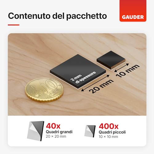 ADESIONE FORTE - I magneti adesivi GAUDER (10 x 10 x 2 mm) sono dotati di una pellicola adesiva e protettiva sul retro, che garantisce una tenuta duratura e salda su diverse superfici lisce, come legno, plastica, metallo o ceramica.