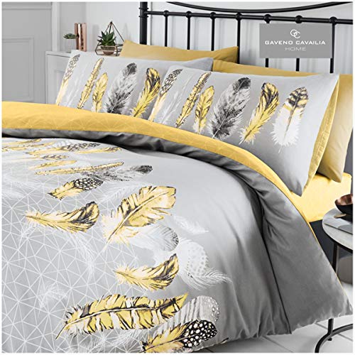 GC GAVENO CAVAILIA - Copripiumino stampato, set di biancheria da letto in policotone, modello Feathers, giallo, letto matrimoniale (200cm x 200cm)