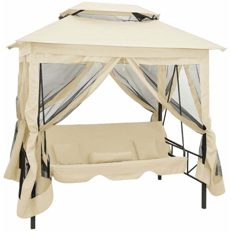 Questo elegante e spazioso dondolo a gazebo, con un design ampio ed elegante, pu¨° accogliere comodamente due persone e crea ombra grazie al suo grande baldacchino. Grazie alle tende dotate di chiusure a strappo, si possono facilmente chiudere tutti e quattro i lati per creare un'area chiusa. La fitta rete ¨¨ perfetta per tenere lontani gli insetti e offrirvi un riparo privato. Il sedile pu¨° essere convertito in un letto. Per un maggiore comfort sono inclusi due cuscini rettangolari e due cuscini cilindrici. La resistente struttura in acciaio ¨¨ stata verniciata a polvere che ¨¨ resistente alla corrosione. Le fodere impermeabili dei cuscini, realizzate in poliestere, sono rimovibili per una facile pulizia. Anche l'assemblaggio ¨¨ molto facile. Colore: Bianco crema Materiale: Tessuto e struttura in acciaio verniciato a polvere Dimensioni: 220 x 160 x 240 cm (L x L x A) Dimensioni del sedile: 156 x 52 cm (L x L) Dimensioni del letto (quando il sedile viene convertito in un letto): 156