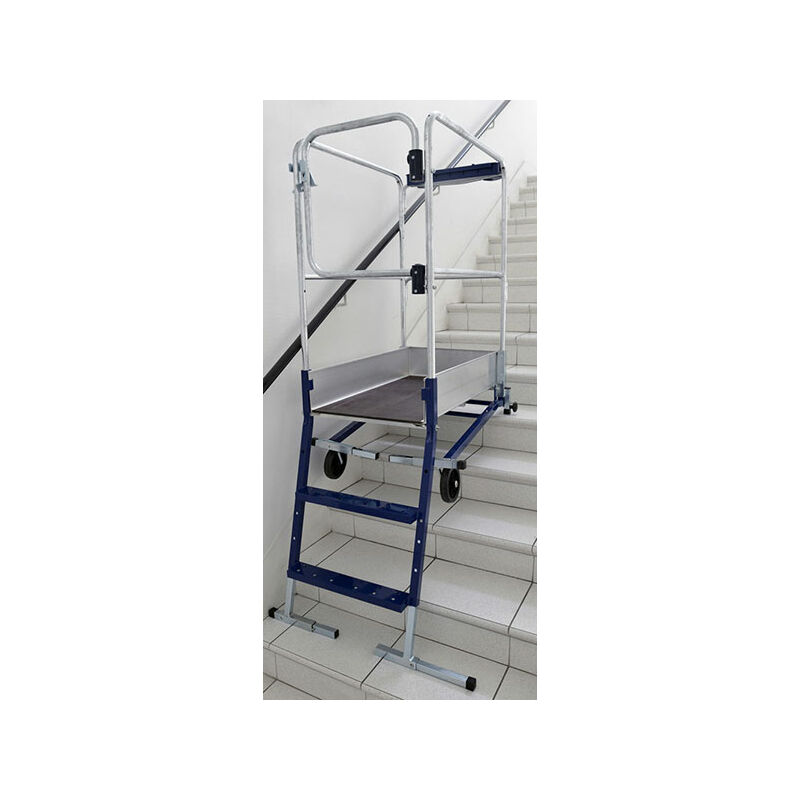 Guaardacorpo e sportello di sicurezza. -Piano speciale. - Tavola porta-oggetti multifunzione a 2 sportelli. - Stabilizzatori rettrattili si Gazelle. - Gazelle mini autostabile. - Gradini comodi e antidirapanti laarghi 80 mm. - Ruote di spostamento Ø 150mm. - Installazione del trabattello gazelle su zone a dislivello: regolazione indipendente dei 4 piedi.