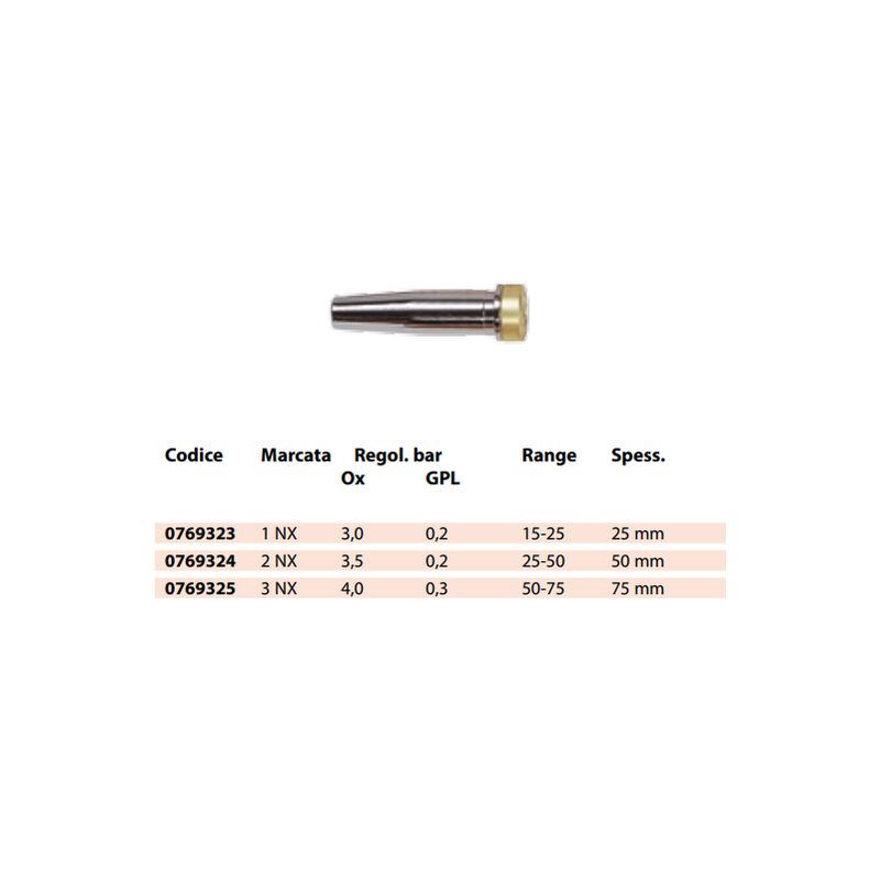 GCE-MUJELLI PUNTE DA TAGLIO PROPANO GPL METANO PER CANNELLO MUJVER IN DUE PEZZI CODICE MARCATURA REGOL. BAR OX REGOL. BAR AC RANGE SPESSORE 0769323 1 NX 3.0 0.2 15-25 25 mm 0769324 2 NX 3.5 0.2 25-50 50 mm 0769325 3 NX 4.0 0.3 50-75 75 mm