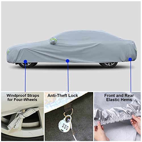 3. Antivento e Antifurto: è assolutamente impossibile soffiare via la copertura dell'auto anche in caso di vento. Le cinghie antivento sono legate alle quattro ruote per il primo passaggio. E il blocco antifurto rafforza la protezione sicura. Gli orli elastici nella parte anteriore e posteriore della fodera abbracciano saldamente il tuo veicolo