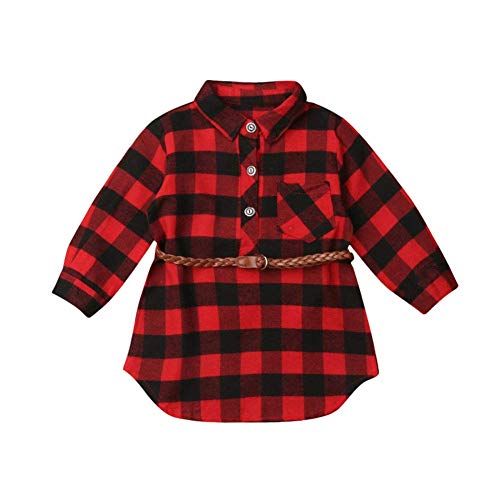 Geagodelia Abito a Camicia per Bambina Neonata Maglietta Scozzese Rossa Manica Lunga Abiti Natalizi Elegante e Carino 0-5 Anni con Cintura (Rosso, 4-5 Anni)