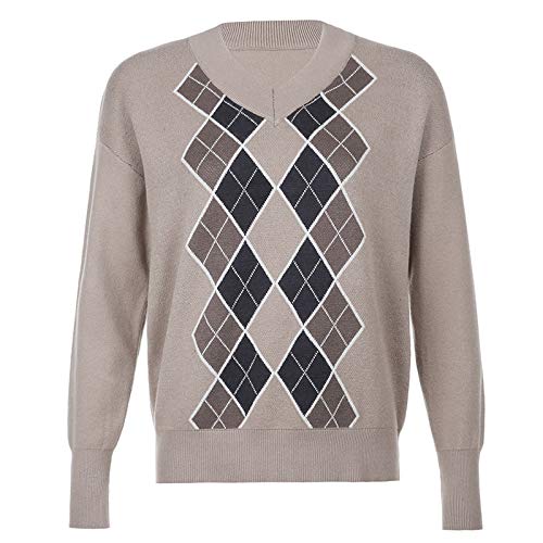 Geagodelia Argyle Plaid Studente Maglione Lavorato a Maglia da Donna Top Classic Manica Lunga Autunno Primavera Abbigliamento Ragazza Casual Pullover (Marrone, S)