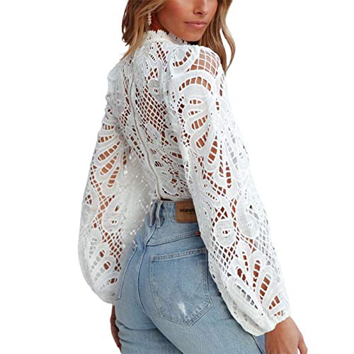 Geagodelia Camicia Donna Elegante Blusa Bianca Lanterna di Pizzo Manica Lunga Svasata all'Uncinetto Vintage Camicetta con Cerniera Posteriore Slim Fit Crop Tops(Bianco,L)