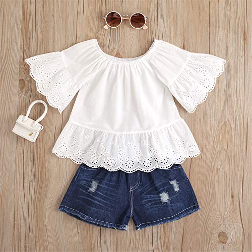 Geagodelia - Maglietta a maniche corte in pizzo con volanti e jeans corti, per bambini estivi, outfit, 2 pezzi bianco 5-6 Anni