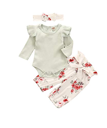 Geagodelia Pagliaccetto con Volant Floreale per Neonata in Cotone 3PC + Pantaloni + Fascia Completo per Bambina 0-3 Mesi Autunnale e Invernale (Verde B, 18-24 Mesi)
