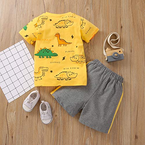 Geagodelia 2 Pezzi Completo Bambino Neonato Estivo Maglietta Manica Corta T-Shirt Camicia con Stampa Dinosauri + Pantaloncini Tuta Bambino Sportiva in Cotone Estate (Giallo, 12-18 Mesi)