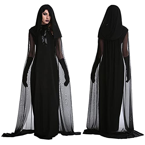 Geagodelia 2 Pezzi Set Cosplay da Donna Mantello Trasparente con Cappuccio + Vestito Lungo Sottile Tinta Unita Gotico Completo per Festa Halloween Gioco di Ruolo (Nero, XL)